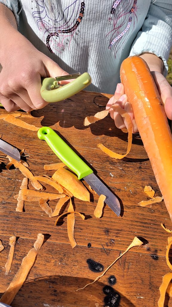 Die Lehrerinnen hatten kleine Mitmach-Aktionen organisiert: von Karotten schälen, Zwiebeln waschen, bis Kartoffeln im Lagerfeuer garen oder Waffeln backen aus Kartoffelteig. Das schmeckte alles vorzüglich mit leckeren Dipps und die (Groß)Eltern hatten ein reichhaltiges Fingerfood Buffett organisiert. Barbara Hucht begrüßte die vielen Gäste vorm Landhaus und lud ein, auch das neue Labyrinth zu laufen. Die Kinder tobten ausgelassen über das Gelände, während die Eltern die Herbstsonne auf Picknickdecken genossen oder an den Bierbänken angeregte Gespräche führten. Manche konnten sich an Landhauswochenenden aus Jugendtagen erinnern, andere waren zum ersten Mal ums Landhaus unterwegs. Die Kinder haben eine bunte Wimpelkette mit ihren Wünschen gestaltet, die sich nun entlang des Wandelortes zieht. Ein gelungener Abschluss von dem Schulgarten-Projekt 2025 auf dem Wandelort-Gelände. Die Lehrerinnen und nicht weniger Kinder schmieden schon wieder Pläne, was sie im nächsten Jahr anbauen und ernten wollen – trotz aller Widrigkeiten mit gefräßigen Nacktschnecken auf Kürbispflänzchen oder langen Trockenperioden. Wir dürfen also gespannt sein, was dort weiter wächst und die Menschen aus der Region zum Wandelort kommen lässt. Wer Interesse hat, auf dem Wandelort-Gelände zu gärtnern oder das Labyrinth mit einer Gruppe zu begehen, kann sich gerne an die Projektgruppe Wandelort vom Landhaus wenden. Wir geben gerne Ideen, Initiativen und Engagement Raum. Und wer selber neugierig auf den Wandelort ist, kann auf der frei zugänglichen Fläche gerne vorbei schauen und verweilen. Gerade lohnt sich ein Blick in den Himmel, denn ganz unterschiedliche Greifvögel kreisen derzeit über dem Labyrinth.