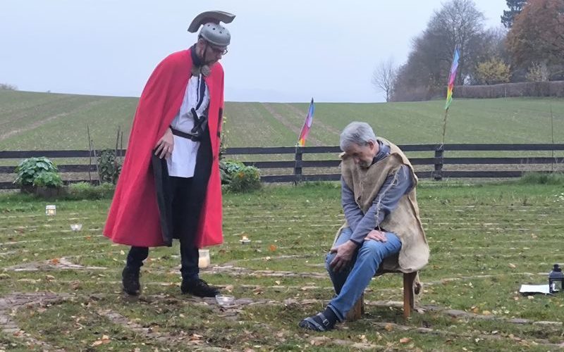 Ein römischer Soldat mit Helm und Mantel teilt diesen mit einem frierenden Bettler – so geschehen beim Vereinswochenende vom Landhaus am Heinberg e.V.  in der Mitte des in diesem Jahr neu entstandenen Labyrinths.